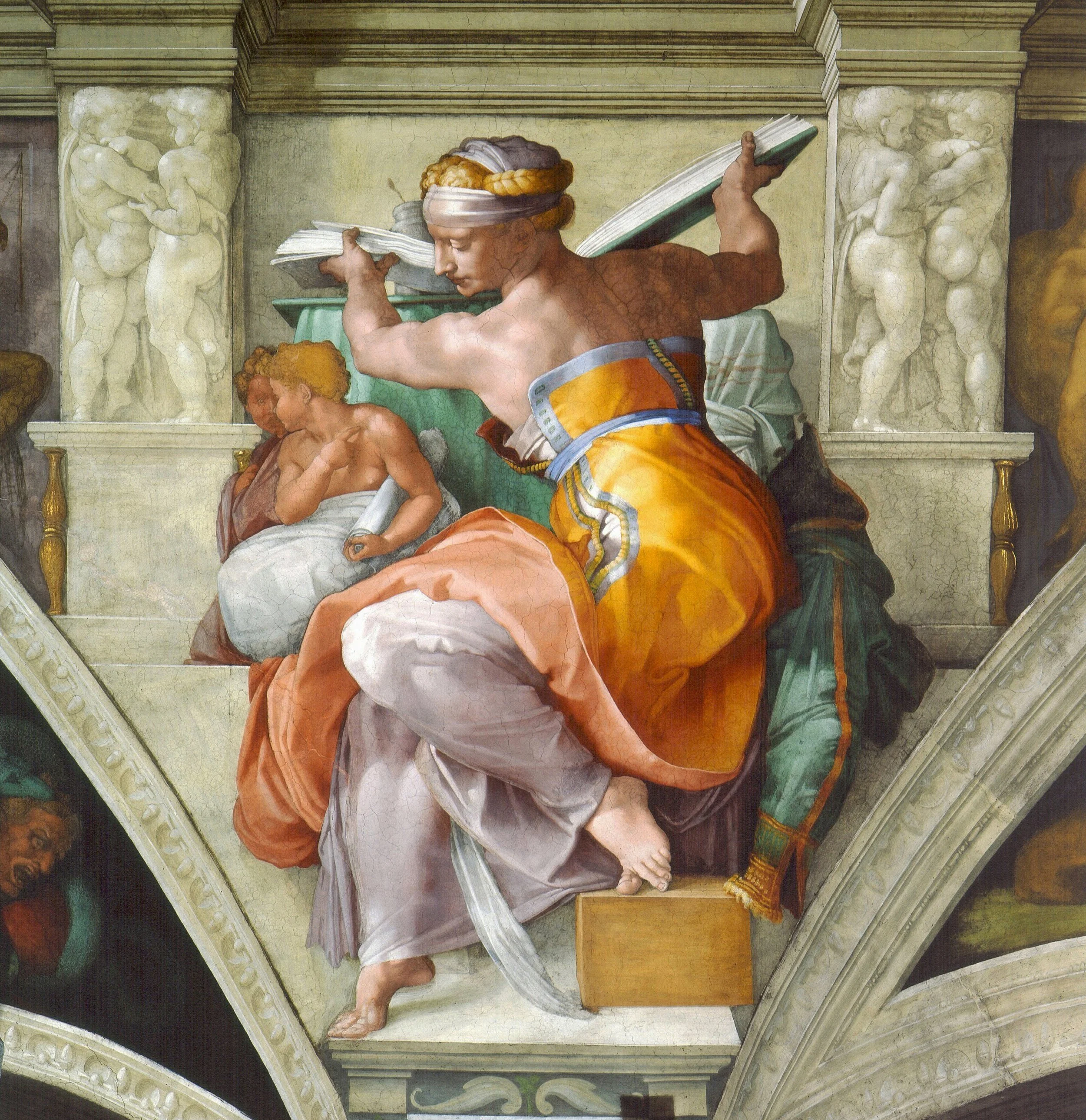 The composition is rich and interesting. The figure is depicted mid-action as she simultaneously closes the book behind her and steps down towards the viewer. The Libyan Sibyl is part of a larger narrative that unfolds across the ceiling, but compositionally this scene has a completeness that enables it to stand on its own.