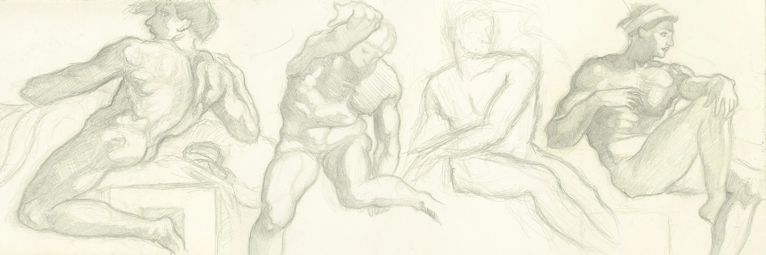 One day, while thumbing through my old sketchbooks, I stumbled upon sketches I’d made of the Ignudi (below) that Michelangelo painted on the Sistine Chapel’s ceiling. The ideas discussed above struck a chord once again. I decided that my next piece would be an homage to this work that had so greatly inspired me.